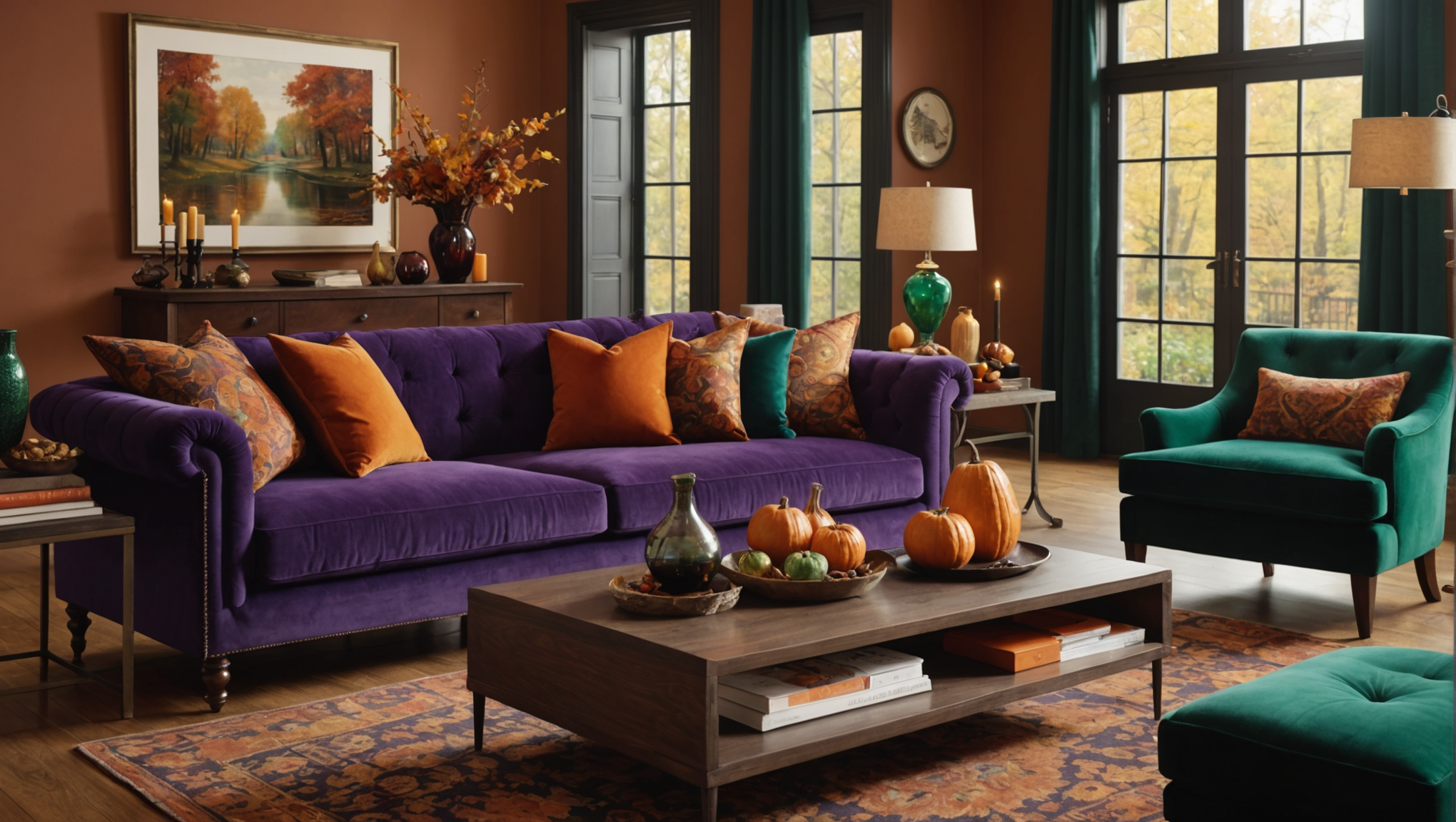 Pour cet automne, les teintes chaudes comme le violet profond, le bleu nuit et les nuances de vert forêt sont à l’honneur. Ces couleurs créent une atmosphère magique tout en restant réconfortantes. N’hésitez pas à peindre un mur accentuellement ou à intégrer des accessoires colorés pour donner le ton !